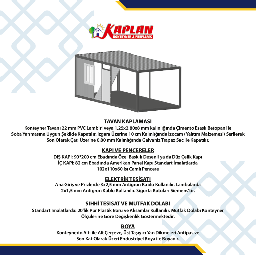 Kaplan Konteyner üretimlerinde yüksek mukavemetli çelik konstrüksiyon ve kaliteli izolasyon malzemeleri kullanmaktadır. Firma, hem Konteyner 3x7 Boş hem de anahtar teslim konut konteyner seçenekleri sunmaktadır.